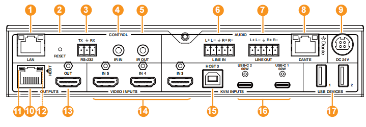 发射器 | 输入: 3 x HDMI INPUT [Type A, 19-pin母口] 2 x USB-C [24-pin母口]; 1 x LINE IN [5pin-3.5mm凤凰端子]; 1 x DANTE [RJ45] 输出: 1 x HDMI OUTPUT [Type A, 19-pin母口] 1 x HDBT OUTPUT [RJ45]; 1 x LINE OUT [5pin-3.5mm凤凰端子]; 控制: 1 x RS-232 [3pin-3.5mm凤凰端子]; 1 x LAN [RJ45]; 1 x USB HOST [USB Type B]; 2 x USB DEVICES [USB Type A]; 1 x IR IN [3.5mm立体声迷你插孔]; 1 x IR OUT [3.5mm立体声迷你插孔] |