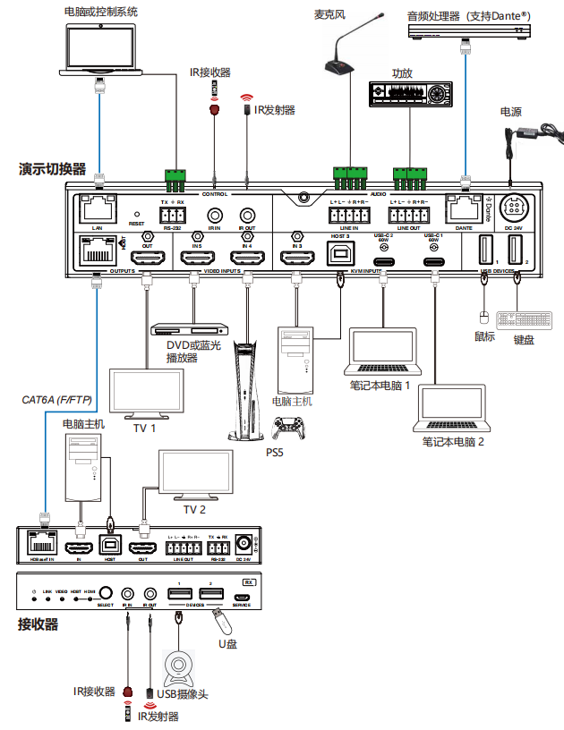 输出:1x HDMI, 1x HDBT镜像, 1x 模拟音频, 1x Dante® 2ch;