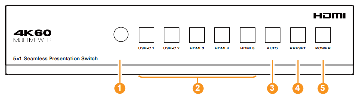 2 | USB-C 1 / USB-C 2 / HDMI 3 / HDMI 4 / HDMI 5按键 | ▪ 单画面显示模式下,按USB-C 1 / USB-C 2 / HDMI 3 / HDMI 4 / HDMI 5按键选择信号输入通道,相应的按键灯亮。 ▪ 多画面显示模式下,输入按键灯指示输出。例如,三画面输出对应USB-C 1, HDMI 3和HDMI 5输入信号源时,相应的3个按键灯亮。当三画面输出只对应一个USB-C1输入信号源时,只有相应的USB-C 1按键灯亮。多画面显示可以通过Web GUI进行设置。多画面模式下,按任意输入按键将切换回到单画面模式。每次按键灯亮1秒钟后会自动熄灭。 |