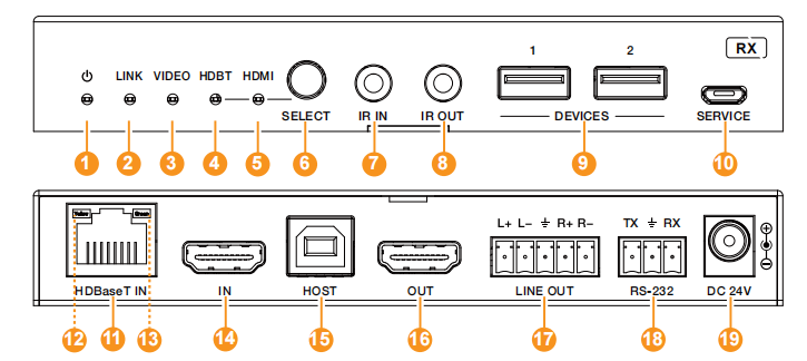 19 | DC 24V接口 | DC 24V电源接口。注意:接收器还可以通过HDBaseT IN端口POE供电。 |