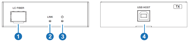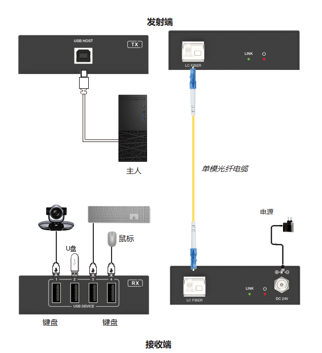 接收端 | 输入:1根LC光纤IN [LC母头] 输出:4个USB设备[USB Type A,4针母头] |